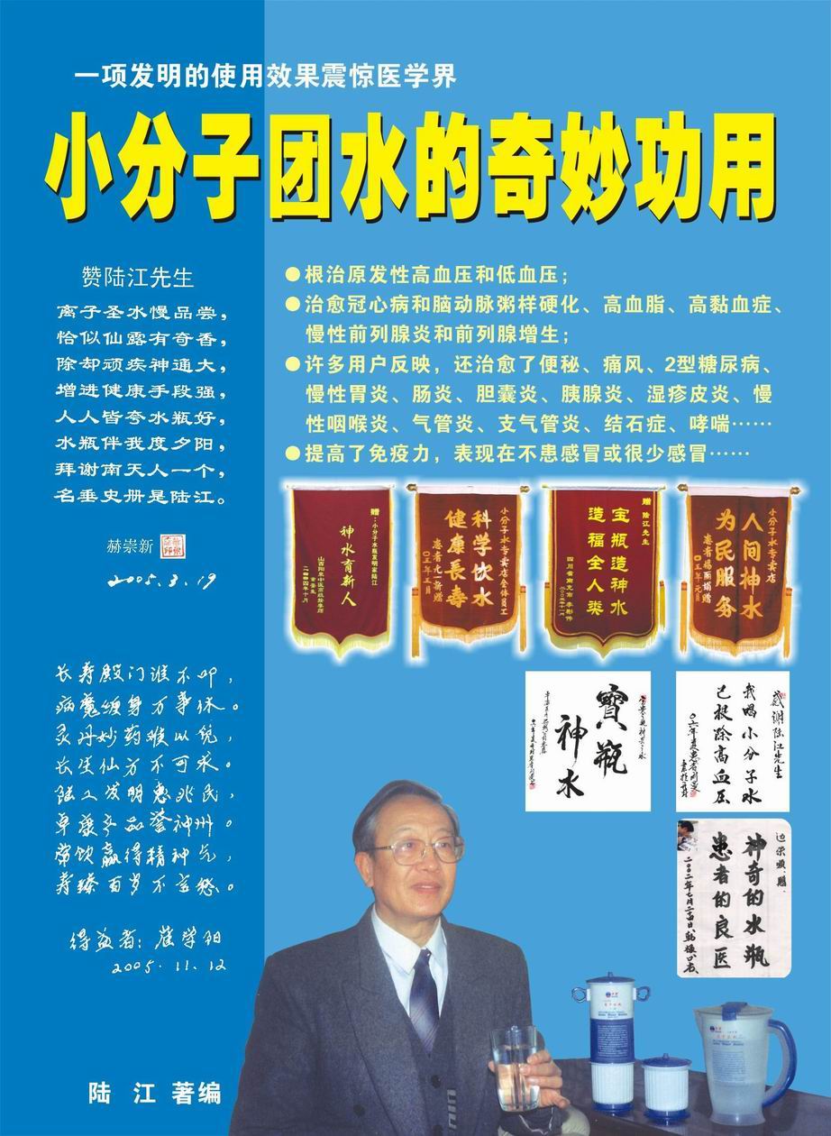 人類幾千年來患以上病癥需終生服藥,幾十年也不能治愈。可是我國南寧的高級工程師陸 江,于1990年想根治高血壓,研究發明了離子水瓶,處理出微小分子團水供飲用,經過醫院臨床試用和專家鑒定,1999年獲中國發明專利權,產品于2000年投放市場后一直跟蹤調查,據全國各地用戶反饋:祛除了高低血壓、糖尿病和冠心病,并使前列腺增生、咽喉炎、鼻竇炎、慢性氣管炎、支氣管炎、矽肺病、哮喘、慢性胃炎、腸炎、慢性膽囊炎、慢性腎炎、腎衰、膀胱炎、便秘、痔瘡、風濕性關節炎和濕疹皮炎及中風后遺癥等病癥不藥而愈。為什么喝微小水能治20多種病?陸 江從1991年德國科學家發現細胞膜水通道僅為2納米獲得啟發,認為多種器官患病是因細胞脫水,不能正常代謝和分裂增殖,才使器官細胞減少致衰弱萎縮而形成細胞缺水性病癥。22年來的實踐有力地支持了“細胞脫水致病”這一重要論點,表明喝微小水可滿足細胞的生理需求,補水就能祛病,是生命科學新亮點。